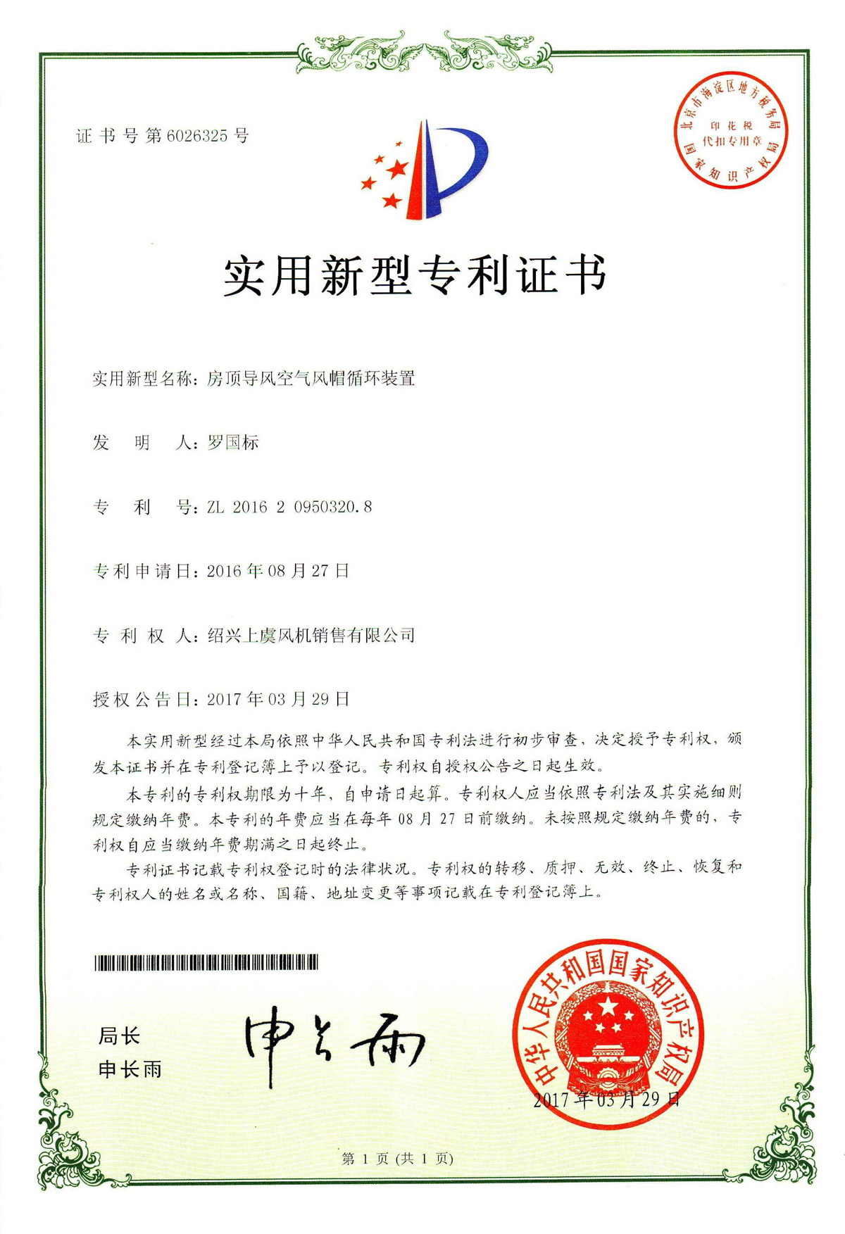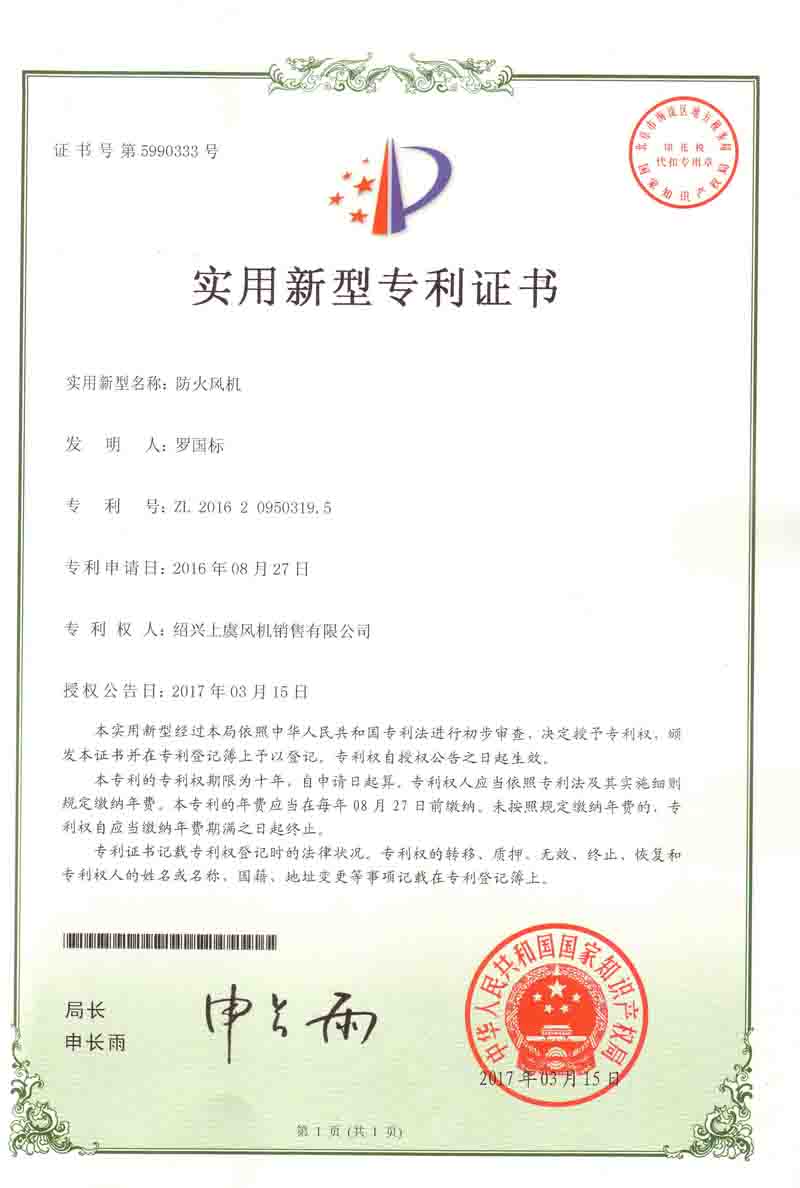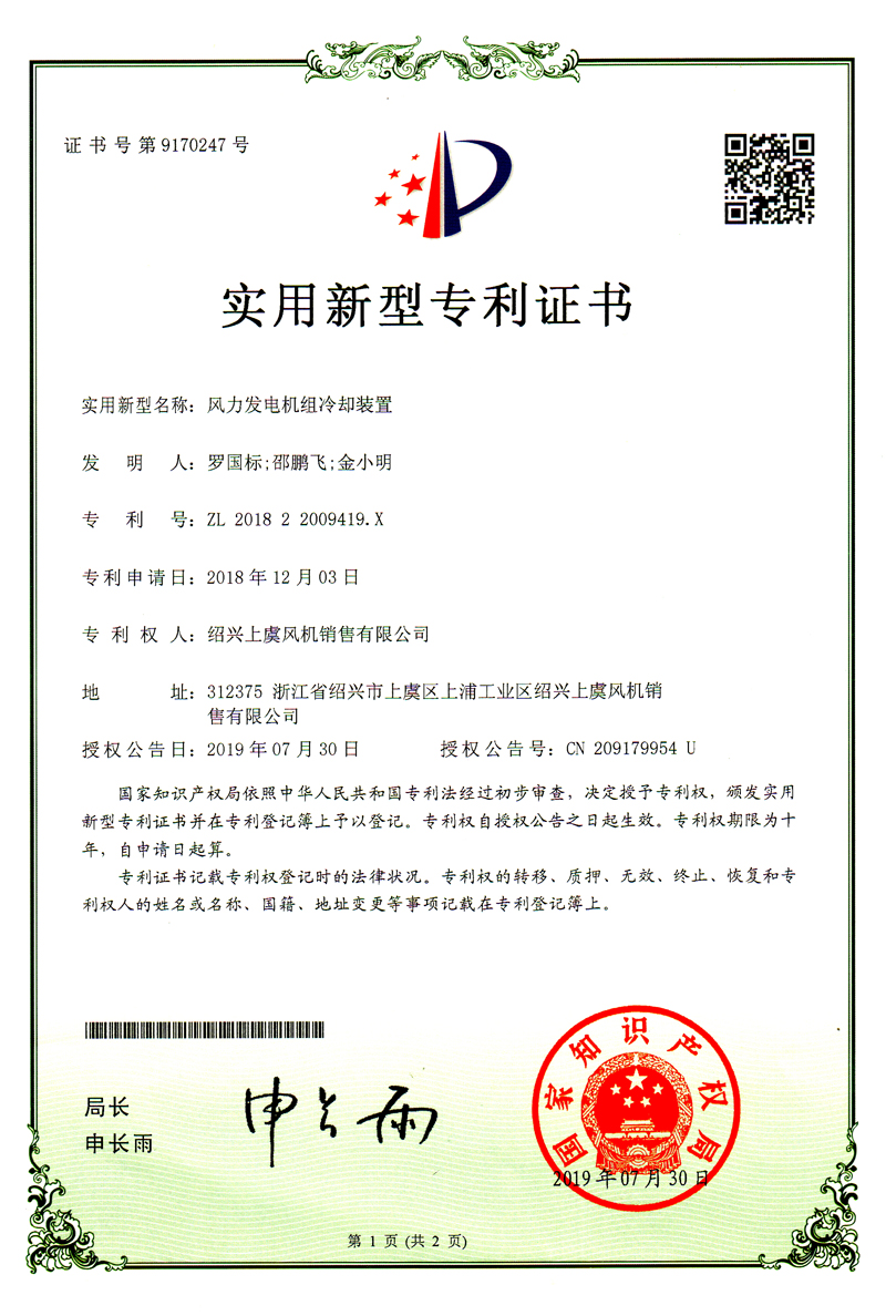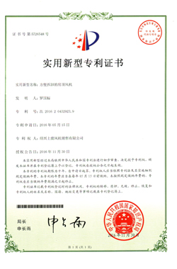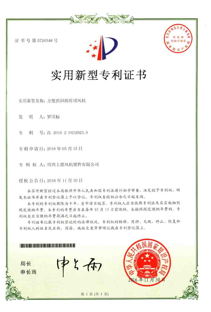 方便拆卸的房頂風(fēng)機專利證書 離心風(fēng)機葉片及輪轂專利證書 離心風(fēng)機專利證書 風(fēng)力發(fā)電機足冷卻裝置專利證書
